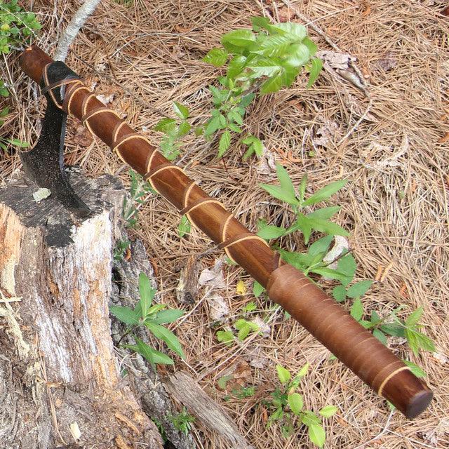 The Viking battle axes were probably the most used weapon of the Viking age, possibly apart from the spear. Whereas swords were prestige weapons, axes were the weapon of the common man. The Viking warriors were mostly farmers and farmhands without huge budgets to buy weapons so their axe was the natural choice. Vikings that were skilled and powerful enough could cut through armor and chainmail. The axe has been hand forged with precision from iron steel. The head has been left with a rough natural finish which gives an authentic aged look. The shaft is made from sheesham that has been stained a rich brown. A leather lace has been crisscrossed in an X design down the handle for grip. Included is a hand sewn leather bit sheath with laces for tying it on. Fully functional this axe can be used while camping or hunting. It also works to complete costumes for re-enactments.