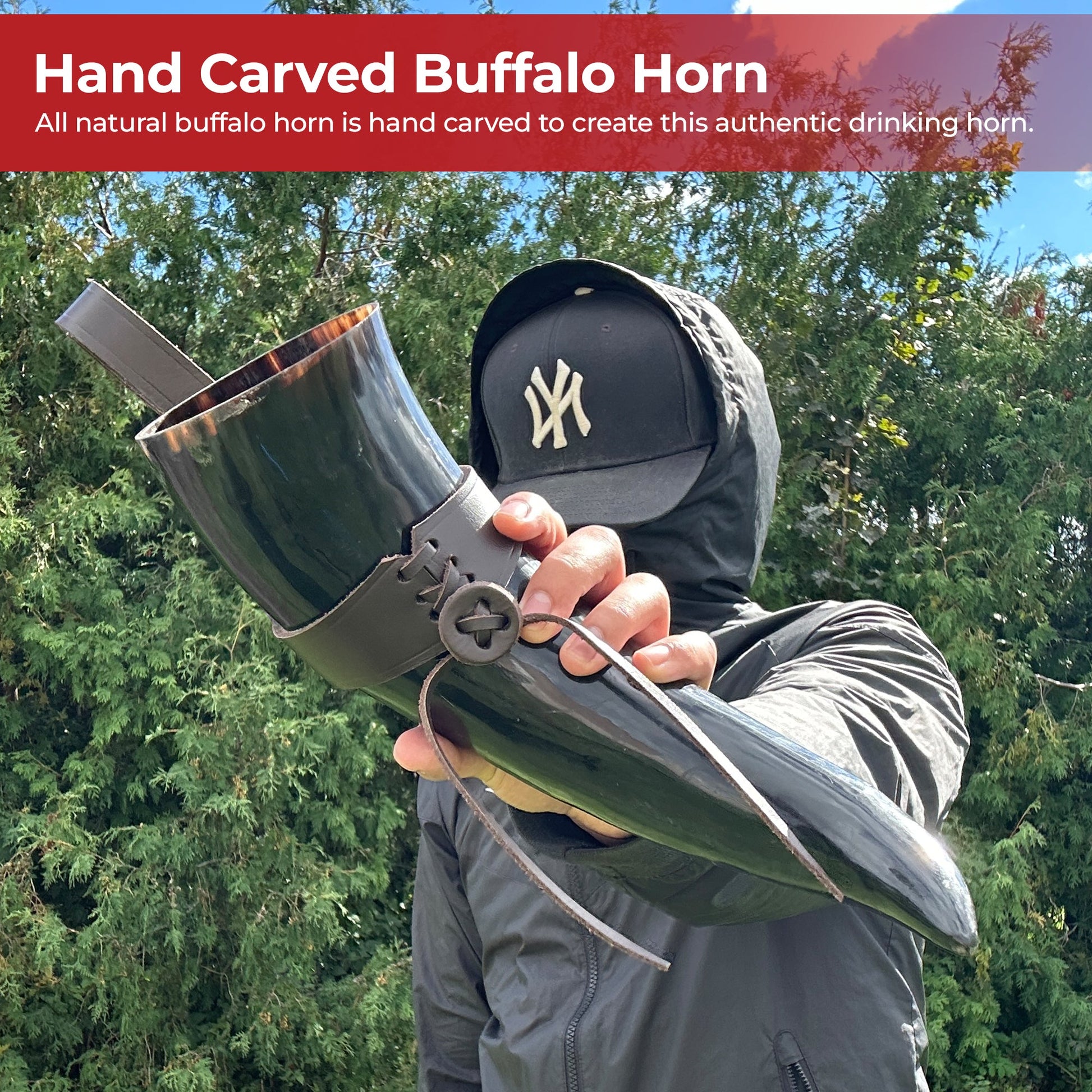 All natural buffalo horn is hand carved to create this authentic drinking horn. Each horn is individually crafted, between 16 inches and 19.5 inches long. No two are the same. They can hold about 24 ounces of water, wine, beer, ale, etc. The exterior is polished to a smooth shine. Coloring of the horn varies according to how it was grown in nature. Mostly it is black and calcium white. A thick leather frog is included and allows it to fix to a belt. Drinking horns were traditionally used in many parts of the world. Sometimes ceremonial, and often as an everyday drinking horn. What is unique about the horn, it cannot be set down on a table until it is empty. Ensure a guest drinks all of their wine with one of these natural drinking horns. * Please note there may be a slight odor as this is a natural item. The color and shape may vary and may not be exactly like the picture. Item may have minor scratches due to buffing and natural material. When measuring this item we measure it at the spine. This is an all-natural item and you will need to coat inside with beeswax. In order to do this you will melt the beeswax and pour it in the horn. Move it around to coat the entire inside and pour out the excess. Please wash with a gentle detergent and polish with vegetable oil to keep it from drying out. And from time to time you will want to use beeswax to coat the inside to keep from cracking. Please do not use hot liquids in this item.