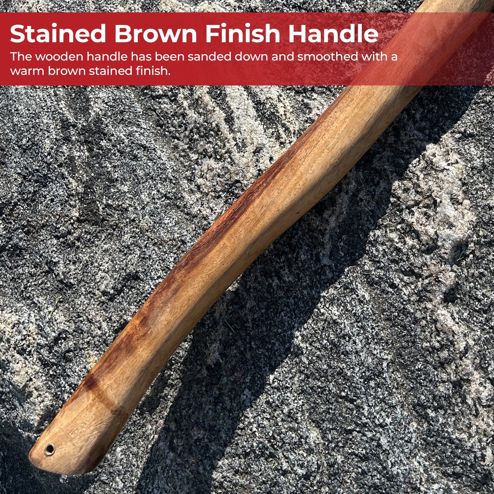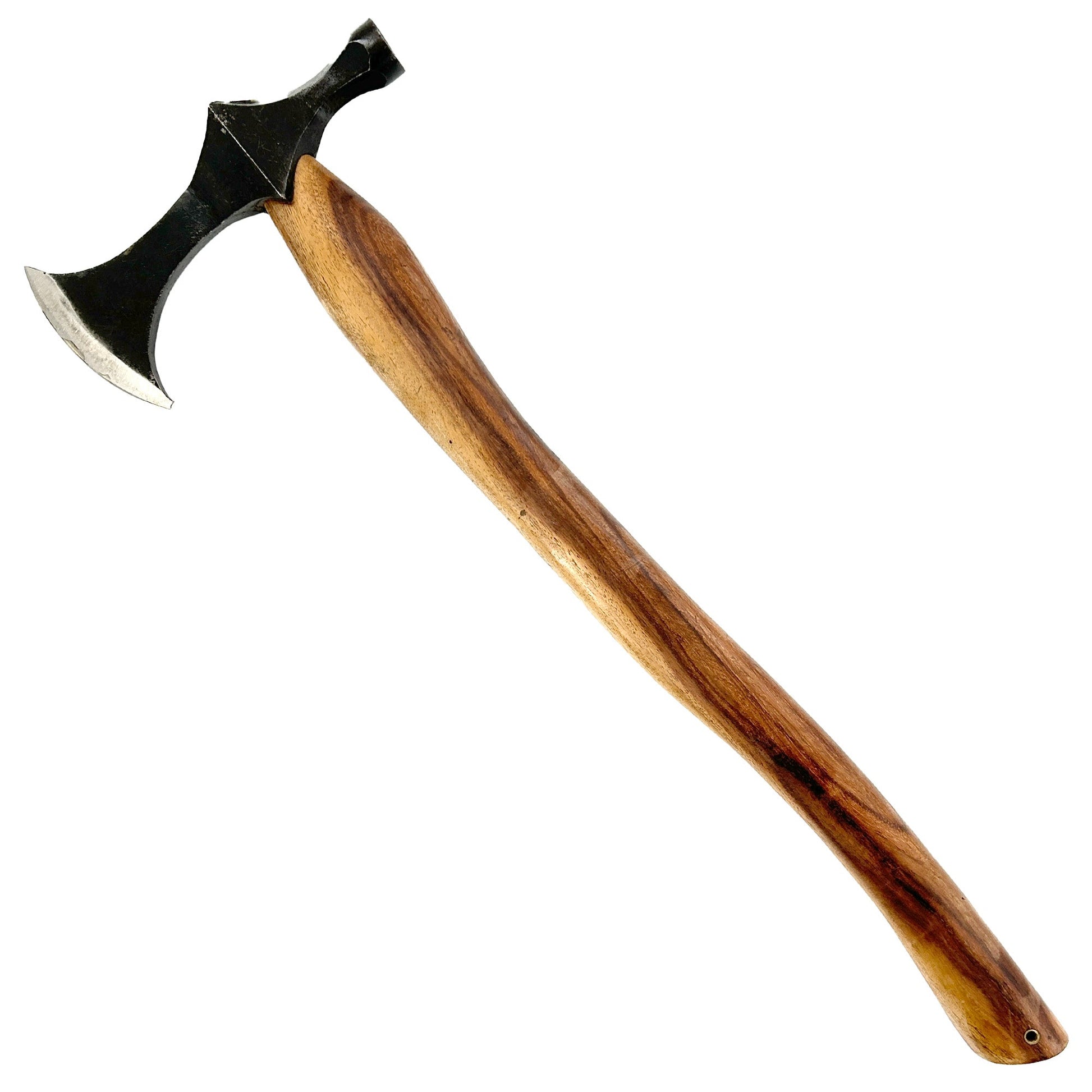 Axes were the one tool that every Viking had at their disposal because they used them so much in their everyday life. As farmers this was probably the most used weapon of the Vikings, possibly apart from the spear. As a weapon, the Viking axes were quite convenient and a very well balanced weapon. They could strike a deadly blow, both from a distance as well as further away. Over time the Viking axe evolved to meet certain needs. This Viking axe features a great bit for chopping, short enough to throw, and has a hammer. The head is constructed of forged iron steel with a rustic stone finish. The wooden handle has been sanded down and smoothed with a warm brown stained finish. The butt features a hammer which can be used to crack heads in the heat of battle or you can use it to hammer in tent stakes that is your choice. Take this blade with you while doing re-enactments or camping doesn’t matter because this fully functional axe can just about do it all.