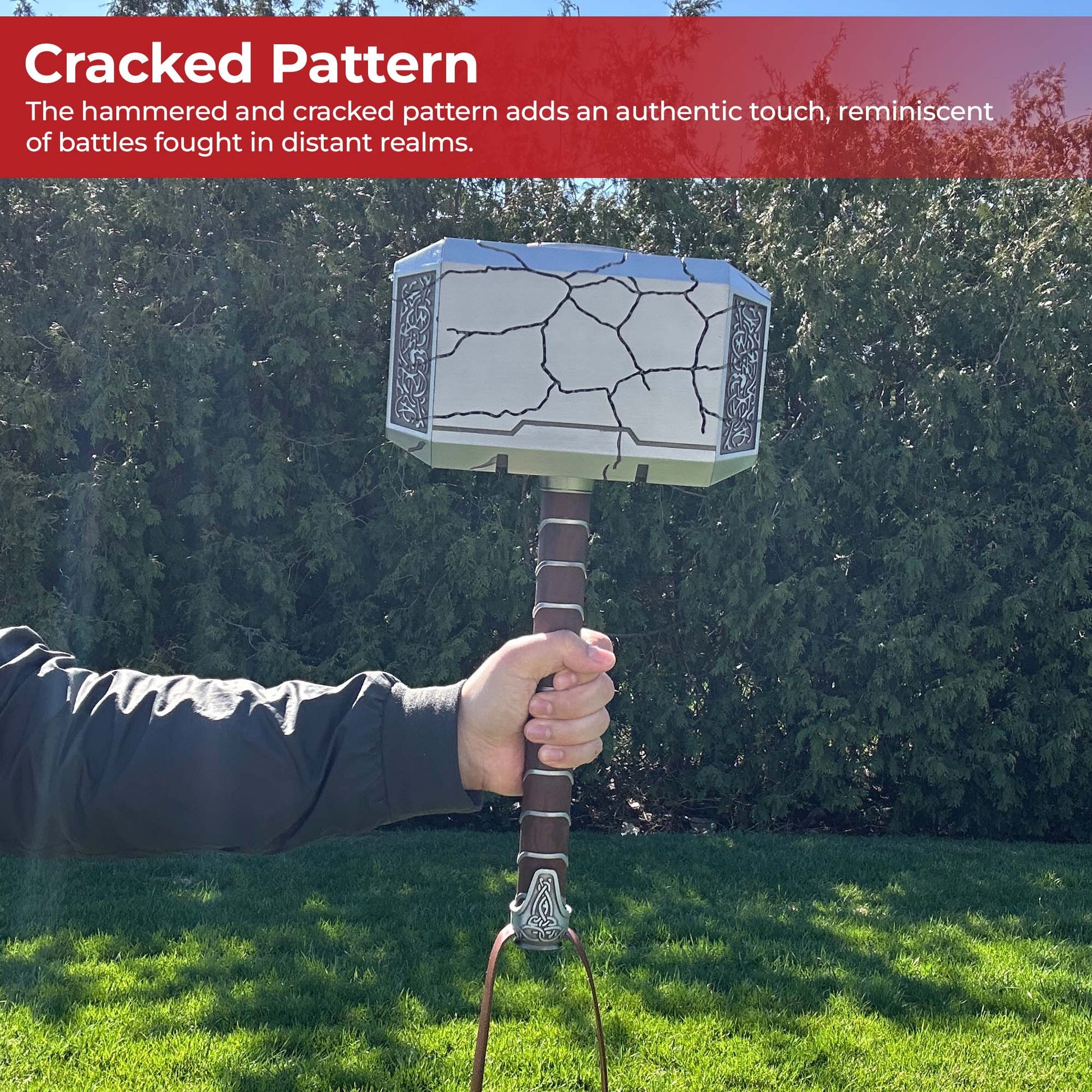 Step into the realm of Asgard with this life-sized and weighted replica of Mjolnir, the mighty hammer of Thor. Crafted from robust steel, the hammer stands at an imposing 17 inches with an impressive weight of 8.2 lbs, capturing the essence of the God of Thunder's legendary weapon. The hammered and cracked pattern adds an authentic touch, reminiscent of battles fought in distant realms. Immerse yourself in the world of superheroes and Norse mythology as you wield the illuminated might of Thor's hammer. Features a remote with several lighting modes and a light up display stand. Perfect for collectors, fans, or those seeking a striking statement piece that seamlessly blends iconic design with cutting-edge lighting technology.