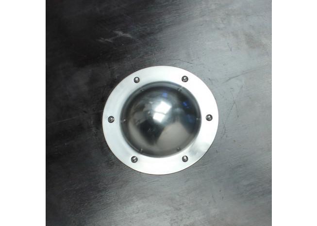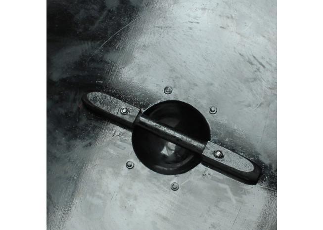 Shields were the most common means of defense for the Vikings. They were commonly used in shield walls, shield forts, and on Viking ships. Gokstad ships had places for shields to be hung on its railing and the Gokstad shields had holes along the rim for fastening some sort of non-metallic rim protection. This protected the Viking crew against harsh waves and wind. This typical Viking shield is Gokstad style and constructed of wood with an umbo in the center and the outer border being 18g steel. The center umbo is 14g steel. The wooden front has a glossy black finish creating a dramatic effect against the steel of the center and edges. This massive shield is historically accurate measuring 30 x 30 inches. Commonly most shields ranged from 30-36. This shield is simple yet has an overbearing quality. It will be a great addition to Viking attire used in re-enactments or just to have for your own collection.
