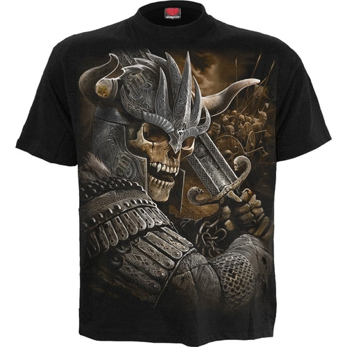 Arm thyself with the sacred weapons of Valhalla and go forth into bludgeoning, bloodthirsty battle. The hordes of skeletal, undead armies clash violently as steel crushes bone. T-Shirt Black is made of Top Quality 100% Cotton, Jersey using skin friendly, Azo-free, Reactive dyes.